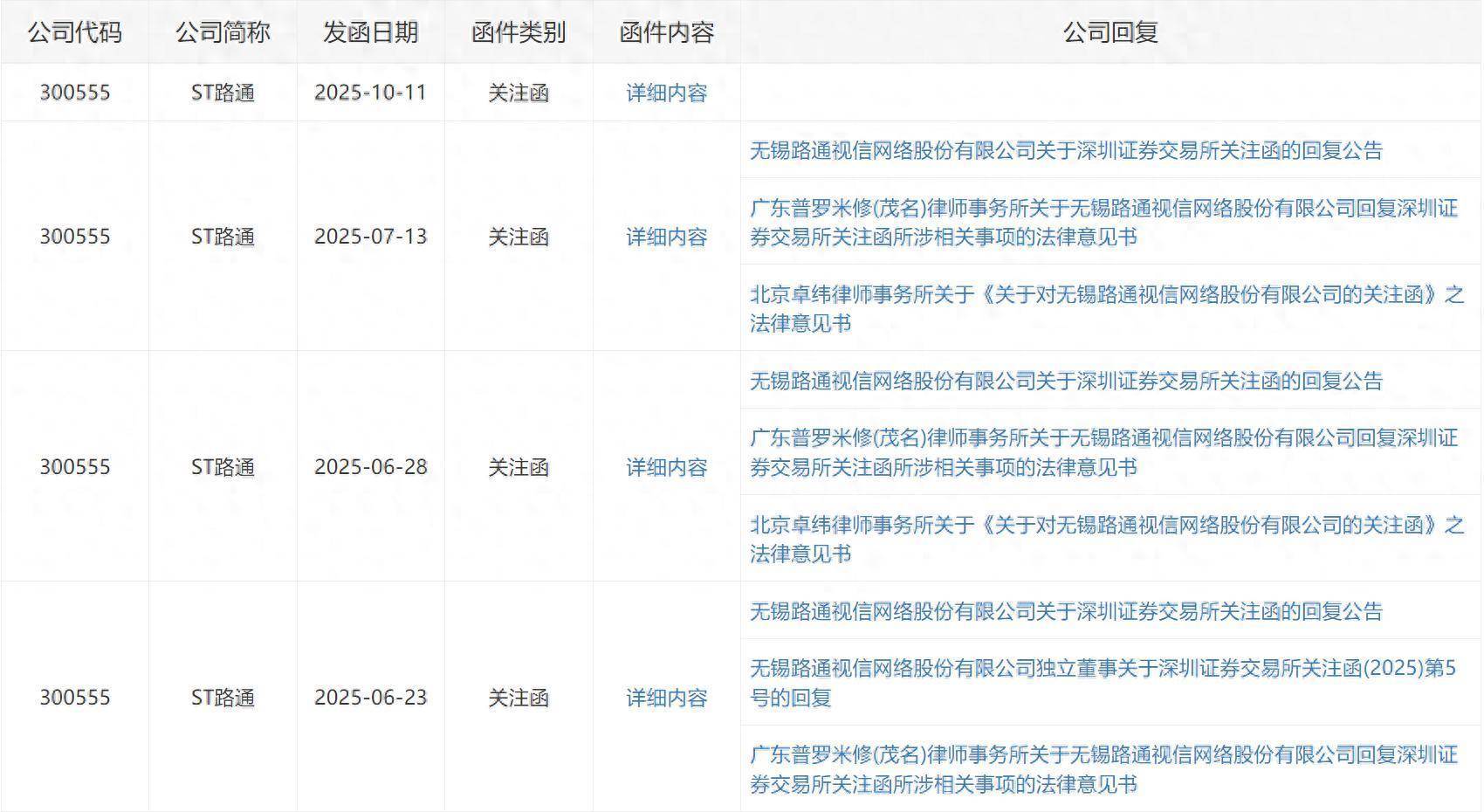 10月11日,深交所向ST路通(300555)发出关注函。值得一提的是,今年6月份以来,ST路通已先后4次收到深交所关注函。